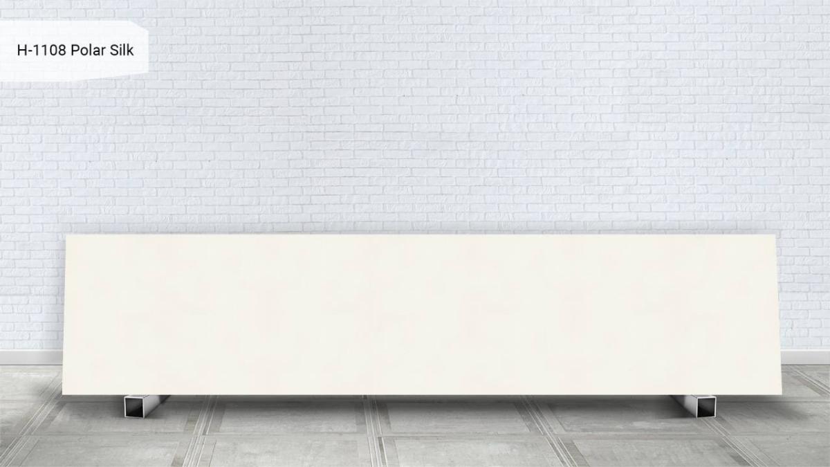 Formax Polar Silk (H-1108) — светлый холодно‑белый оттенок с мягким серебристо‑серым подтоном, цвет выглядит чистым и благородным, без выраженной желтизны и без резкой синевы, текстура выполнена в деликатной минеральной стилистике с мягкими переходами оттенков, по поверхности распределены, молочно‑белые участки светлой базы, лёгкие дымчато‑серые нюансы, тонкие полупрозрачные кварцевидные включения, ультратонкая равномерная зернистость, что делает Formax Polar Silk идеальным для создания расслабляющей атмосферы в любом помещении.