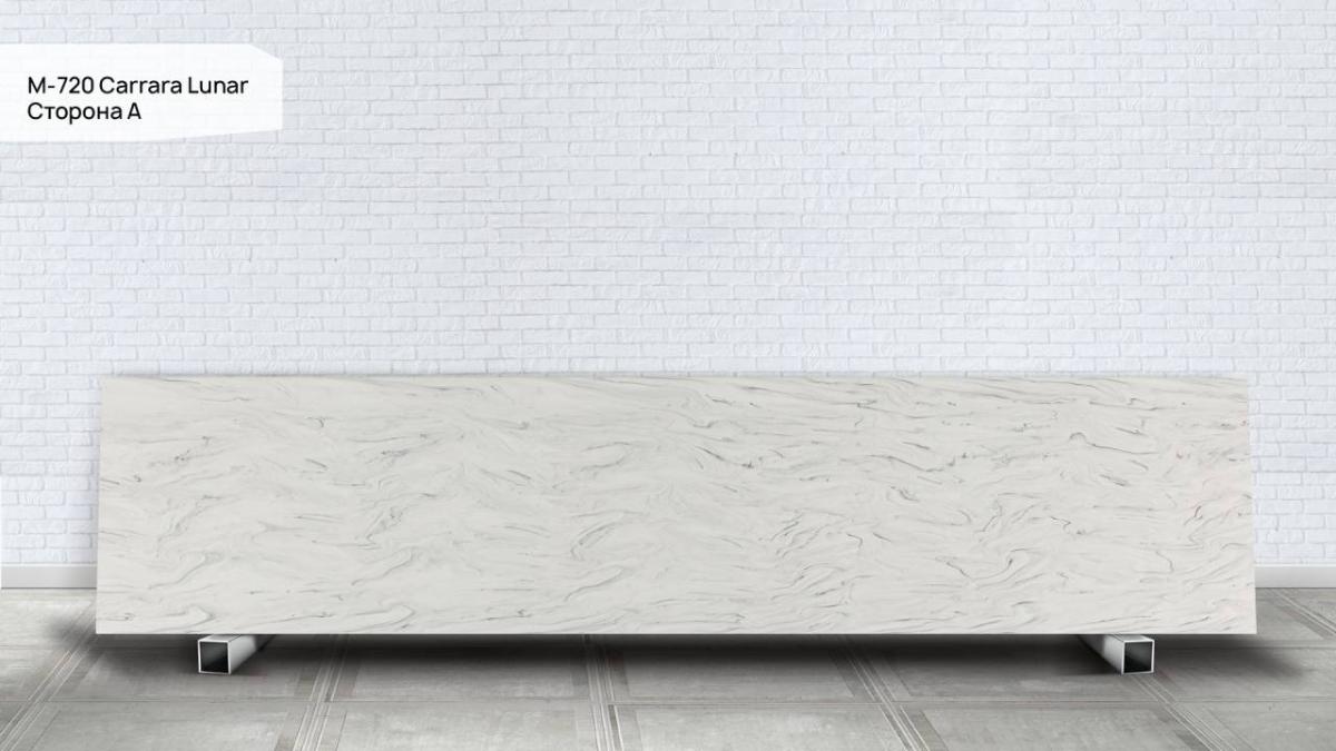 Grandex Carrara Lunar (M-720) — светлый холодный белый с мягким серо‑лунным подтоном, оттенок ровный и свежий, без желтизны и без резкой холодной стерильности, цвет воспринимается элегантным и современным, подчёркивая мраморный характер материала, на поверхности присутствуют тонкие, изящные серо‑графитовые прожилки, плавно распределённые по плоскости, рисунок напоминает классическую каррарскую структуру, но выполнен деликатно и сдержанно без резких контрастов и перегруженности, что делает Grandex Carrara Lunar идеальным для создания расслабляющей атмосферы в любом помещении.
