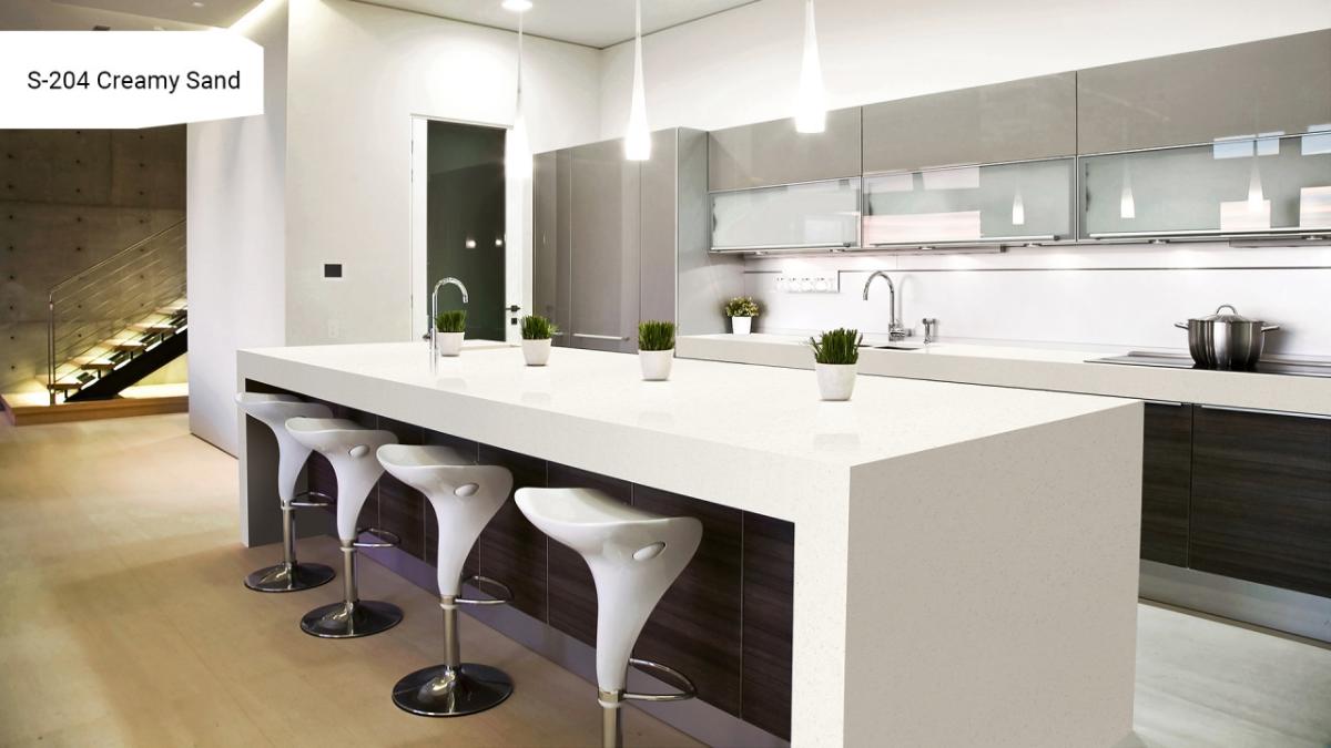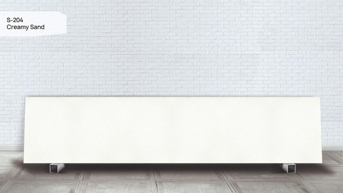 Grandex Creamy Sand (S-204) — светлый кремово‑песочный оттенок с деликатным тёплым подтоном, выглядит очень мягко и естественно, не перегружает пространство и визуально делает интерьер светлее и просторнее, текстура камня сформирована мелкими, однородными вкраплениями, равномерно распределёнными по всей поверхности, включения практически не контрастируют с фоном, благодаря чему рисунок выглядит аккуратным, спокойным и цельным, что делает Grandex Creamy Sand идеальным для создания расслабляющей атмосферы в любом помещении.