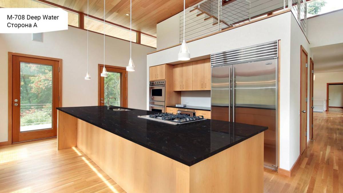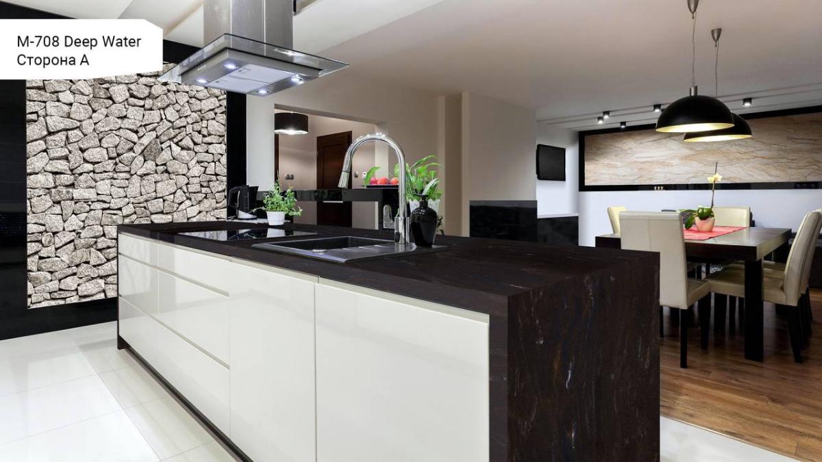Поверхность камня непориста, не впитывает влагу и легко очищается, что гарантирует безупречную гигиеничность и простоту в уходе. Grandex Deep Water устойчив к пятнам от пищевых продуктов и косметических средств, что особенно ценно для активных зон кухни и ванной комнаты.