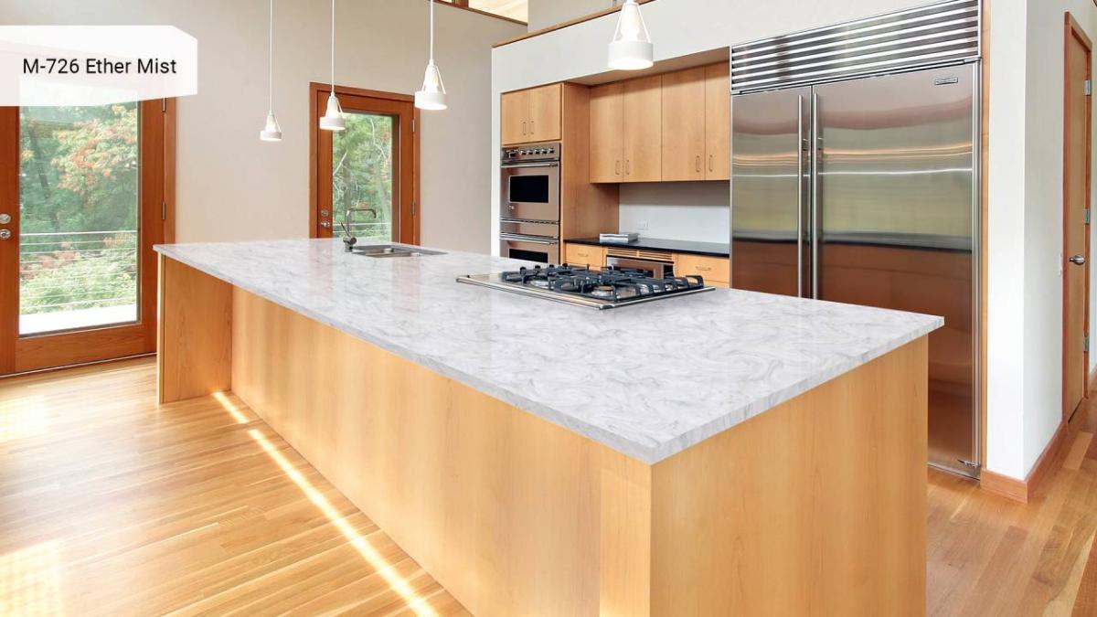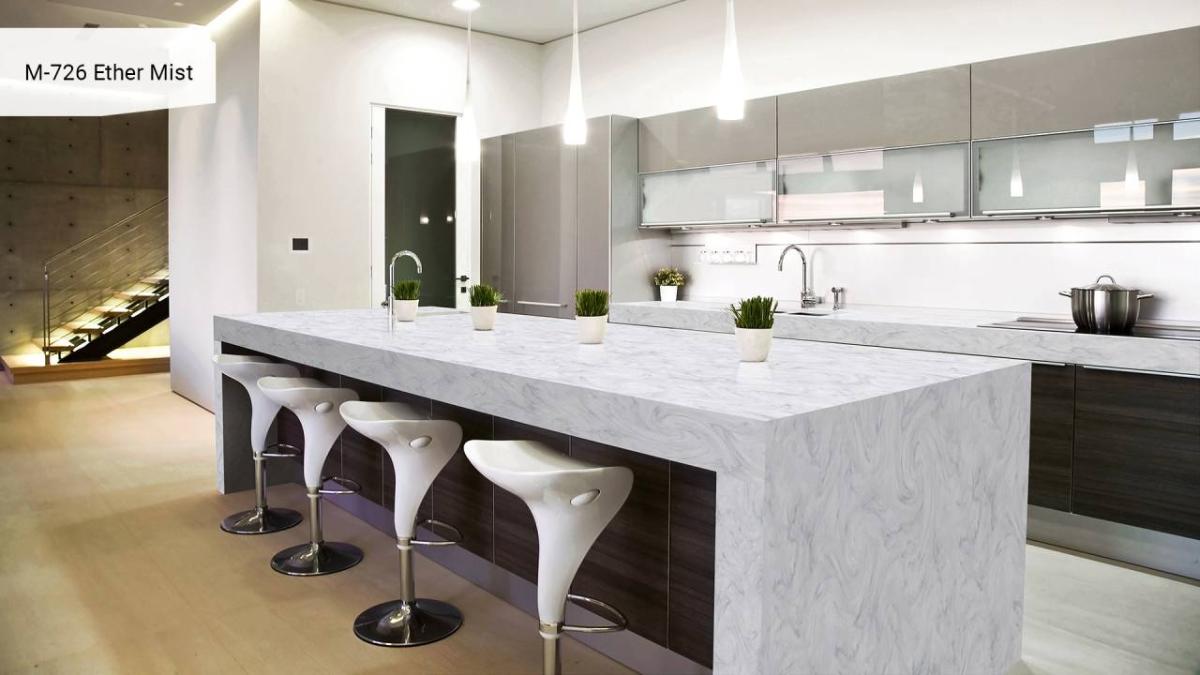 Акриловый камень Grandex Ether Mist обладает высокой ударной прочностью, а благодаря своей бесшовности и ремонтопригодности он идеально подходит для создания столешниц сложных форм и больших размеров. Материал устойчив к бытовым повреждениям, а его способность восстанавливаться позволяет надолго сохранить безупречный вид.