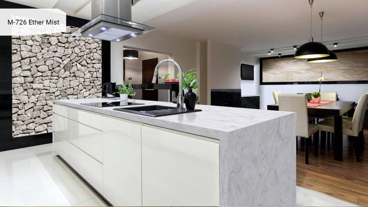 Поверхность камня непориста, не впитывает влагу и легко очищается, что гарантирует безупречную гигиеничность и простоту в уходе. Grandex Ether Mist устойчив к пятнам от пищевых продуктов и косметических средств, что особенно ценно для активных зон кухни и ванной комнаты.