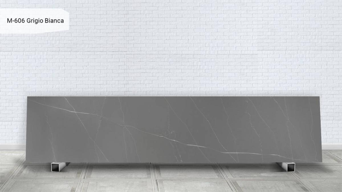 Grandex Grigio Bianca (M-606) — светлый серо‑белый, ровный и нейтральный, без выраженной желтизны и без холодной резкости, фон воспринимается спокойным и универсальным, создавая ощущение света и пространства, поверхность украшена тонкими серыми прожилками, плавно распределёнными по всей плоскости, а также деликатными пересекающимися прожилками стально‑графитового оттенка, что делает Grandex Grigio Bianca идеальным для создания расслабляющей атмосферы в любом помещении.