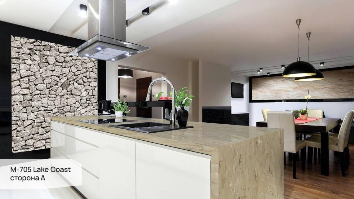 Поверхность камня непориста, не впитывает влагу и легко очищается, что гарантирует безупречную гигиеничность и простоту в уходе. Grandex Lake Coast устойчив к пятнам от пищевых продуктов и косметических средств, что особенно ценно для активных зон кухни и ванной комнаты.