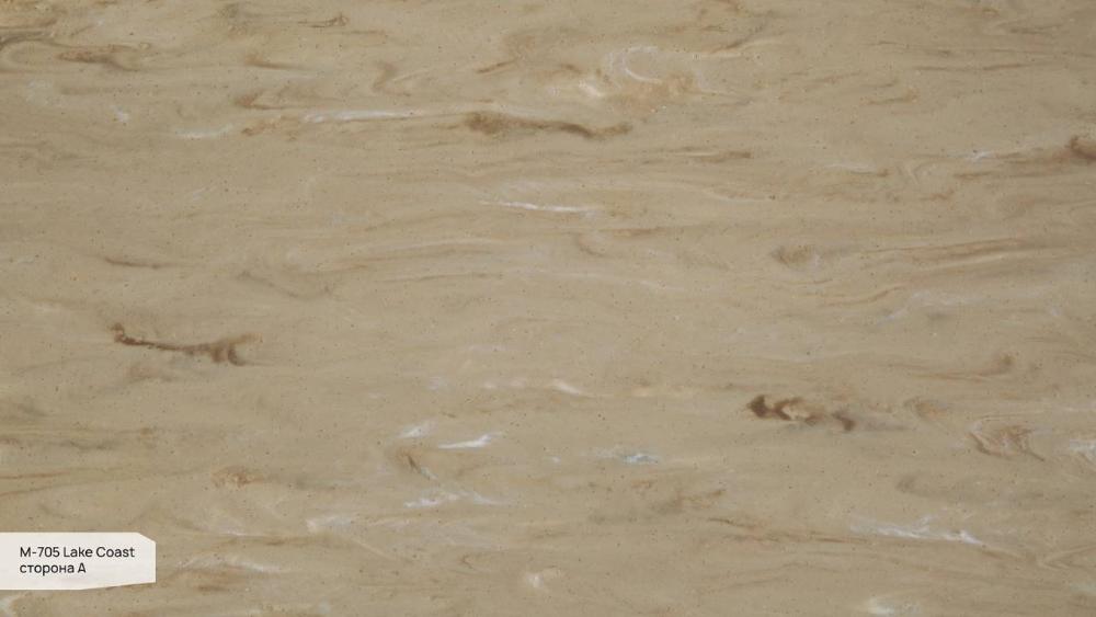 Grandex Lake Coast (M-705) — светлый бежевый, тёплый и естественный, на этом фоне присутствуют разводы разной тональности бежевого от более светлых до чуть углублённых по цвету, а также деликатные белые разводы, которые добавляют поверхности свежесть и визуальную лёгкость, благодаря этому цвет выглядит многослойным и природно неоднородным, текстура дополнена мелкими и средними минеральными вкраплениями, равномерно распределёнными по поверхности, в сочетании с разводами они формируют эффект естественного камня, сформированного водой и временем, что делает Grandex Lake Coast идеальным для создания расслабляющей атмосферы в любом помещении.