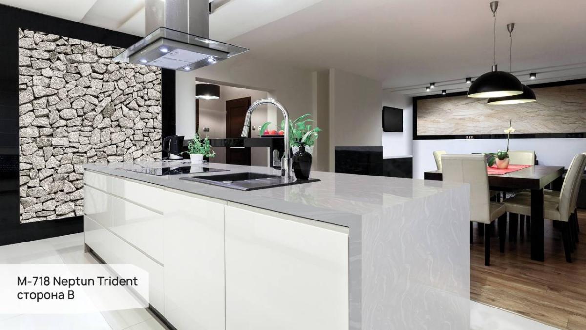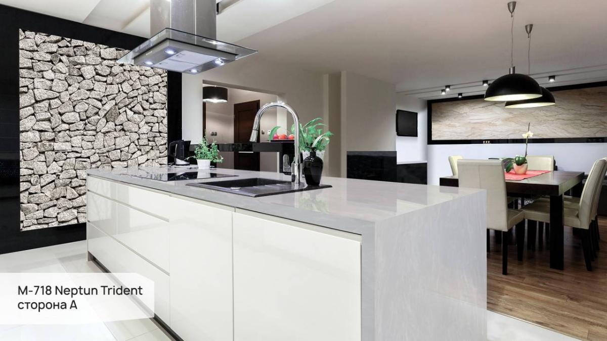 Поверхность камня непориста, не впитывает влагу и легко очищается, что гарантирует безупречную гигиеничность и простоту в уходе. Grandex Neptun Trident устойчив к пятнам от пищевых продуктов и косметических средств, что особенно ценно для активных зон кухни и ванной комнаты.