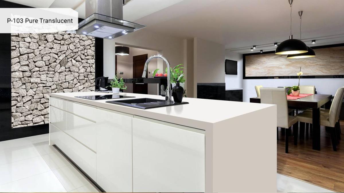 Поверхность камня непориста, не впитывает влагу и легко очищается, что гарантирует безупречную гигиеничность и простоту в уходе. Grandex Pure Translucent устойчив к пятнам от пищевых продуктов и косметических средств, что особенно ценно для активных зон кухни и ванной комнаты.