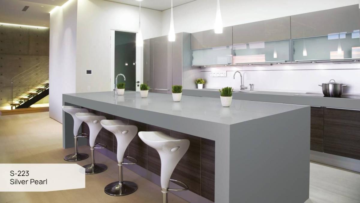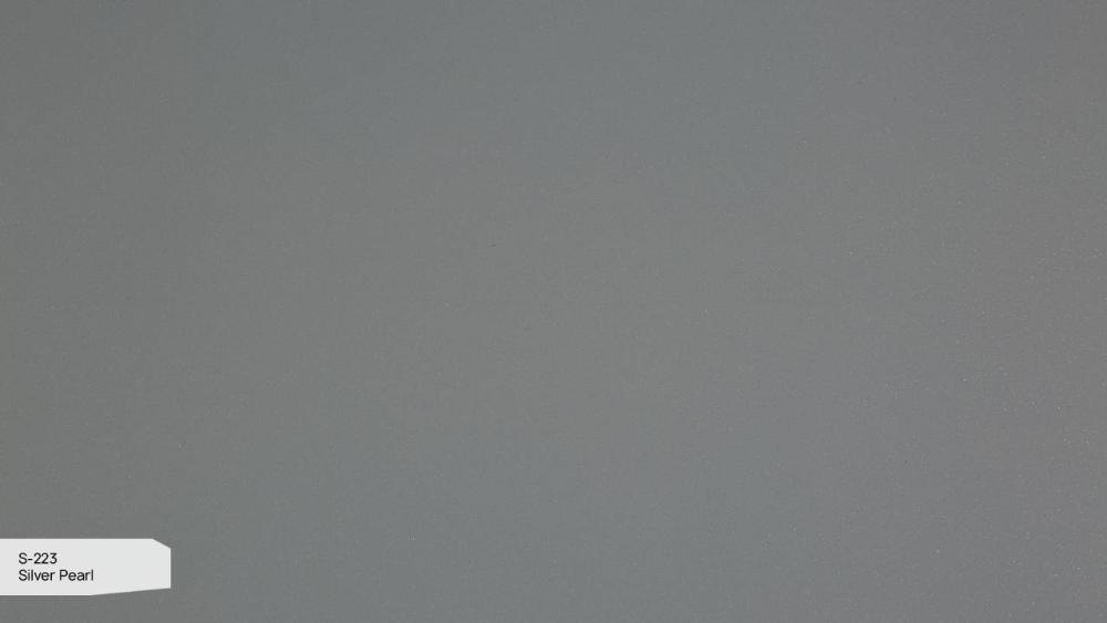 Grandex Silver Pearl (S-223) — светлый серебристо‑белый с мягким серым подтоном, оттенок спокойный и сбалансированный, без резкой холодности, благодаря чему камень остаётся универсальным и легко вписывается в различные интерьерные решения, текстура сформирована очень мелкими, однородными полупрозрачными вкраплениями, которые напоминают жемчужную пыль или перламутровые частицы, что делает Grandex Silver Pearl идеальным для создания расслабляющей атмосферы в любом помещении.