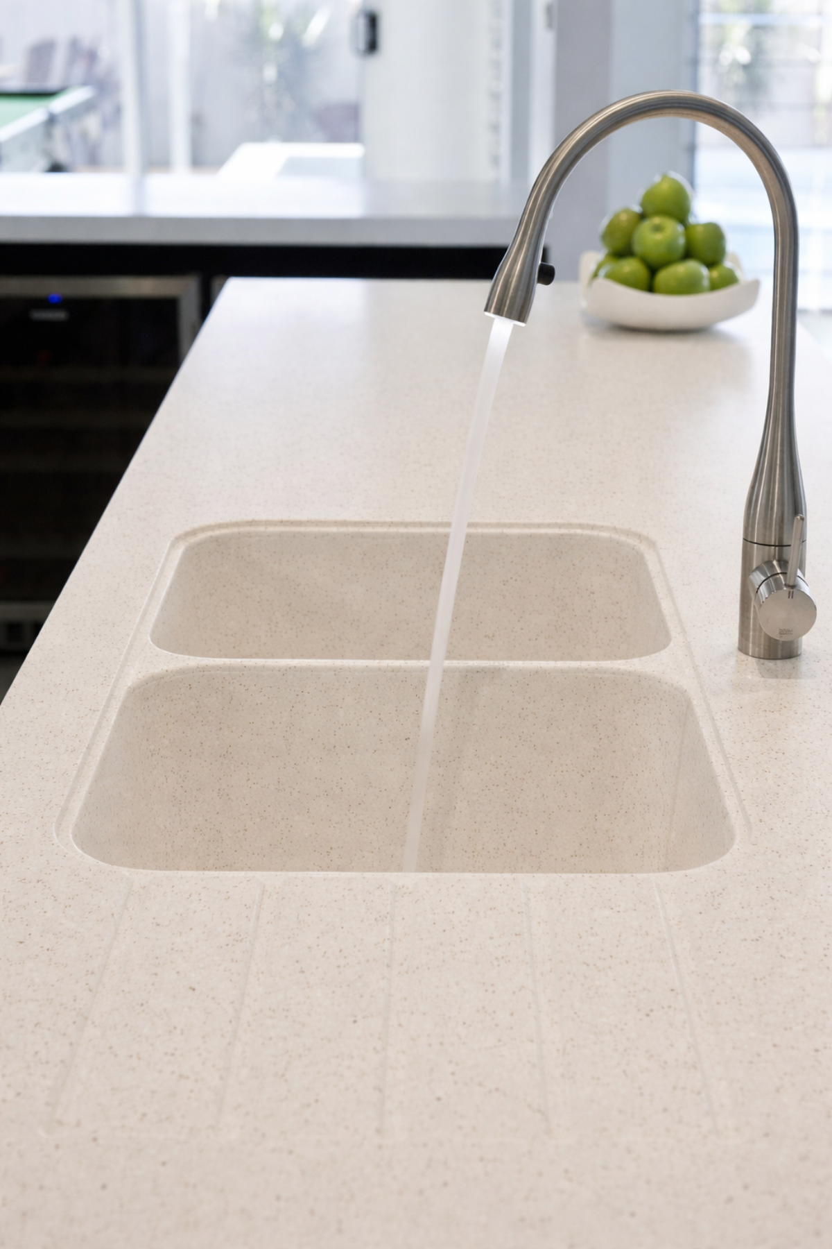 Акриловый камень Staron Aspen Pepper обладает высокой ударной прочностью, а благодаря своей бесшовности и ремонтопригодности он идеально подходит для создания столешниц сложных форм и больших размеров. Материал устойчив к бытовым повреждениям, а его способность восстанавливаться позволяет надолго сохранить безупречный вид.