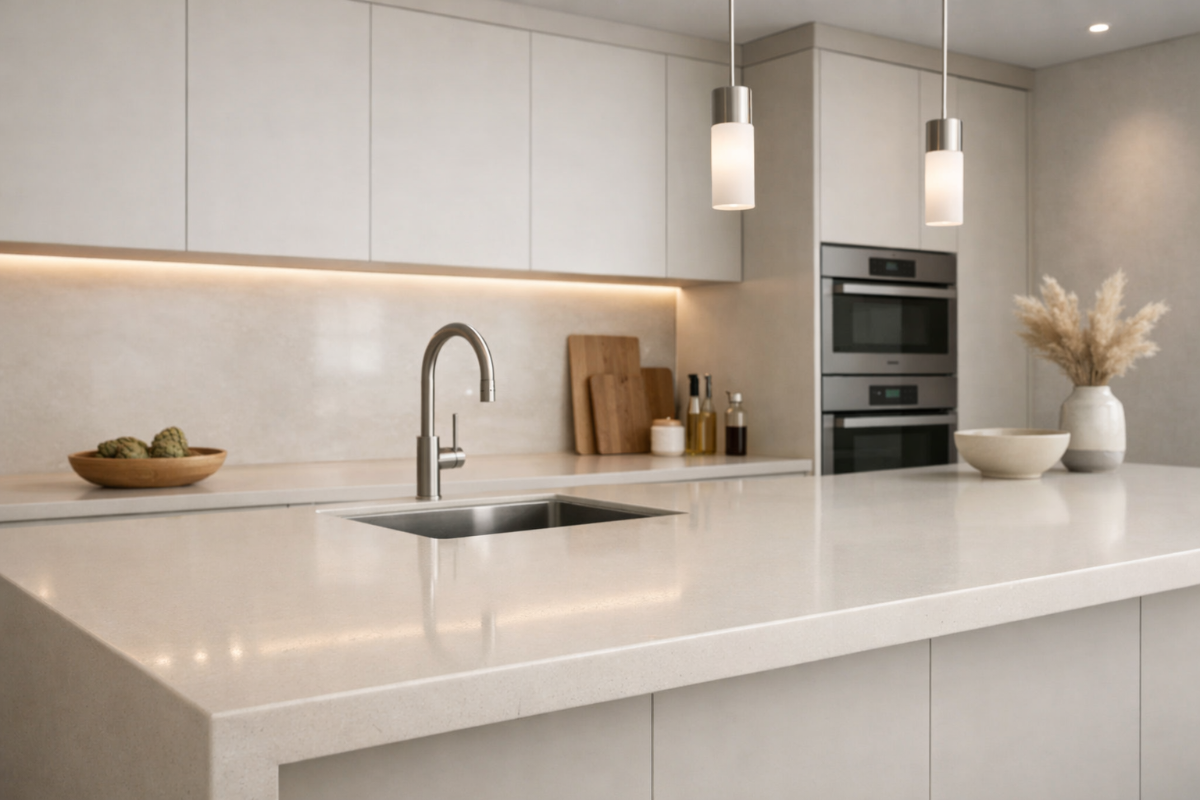 Поверхность камня непориста, не впитывает влагу и легко очищается, что гарантирует безупречную гигиеничность и простоту в уходе. Staron Ivory устойчив к пятнам от пищевых продуктов и косметических средств, что особенно ценно для активных зон кухни и ванной комнаты.