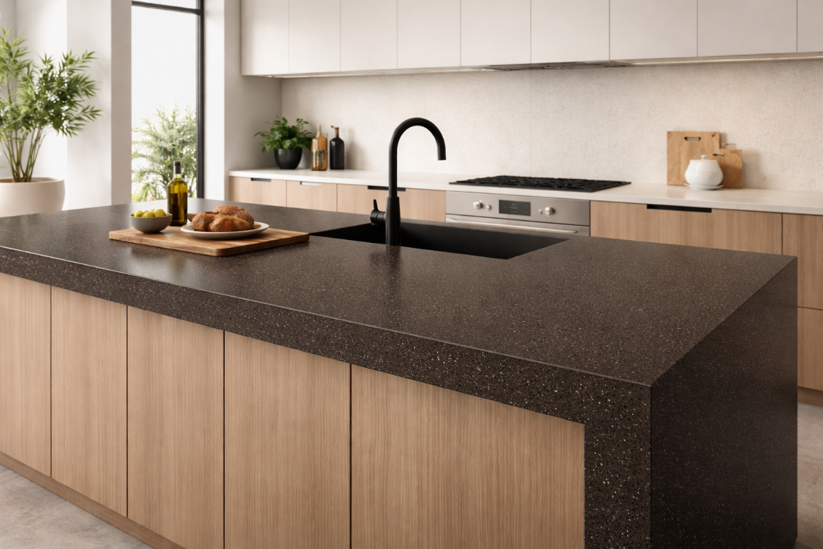 Поверхность камня непориста, не впитывает влагу и легко очищается, что гарантирует безупречную гигиеничность и простоту в уходе. Staron Sanded Chestnut устойчив к пятнам от пищевых продуктов и косметических средств, что особенно ценно для активных зон кухни и ванной комнаты.