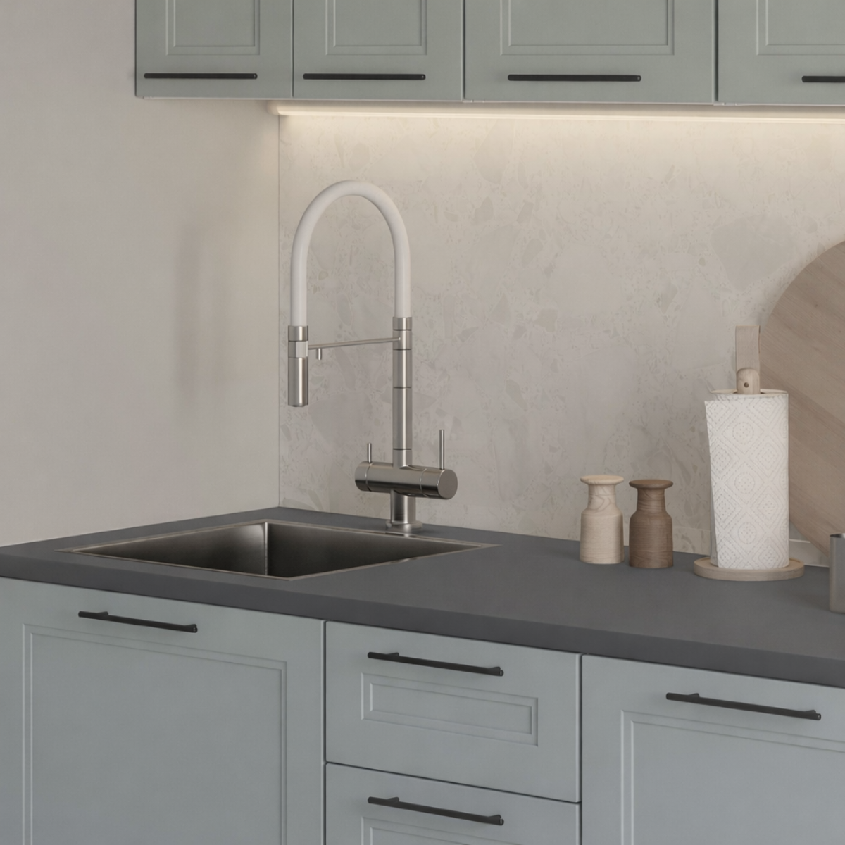 Благодаря своему сдержанному и универсальному дизайну, акриловый камень Staron Steel прекрасно вписывается в различные стили интерьеров — от скандинавского и минимализма до классики и прованса. Он может служить как спокойным фоном, так и ключевым элементом светлой и лёгкой эстетики.