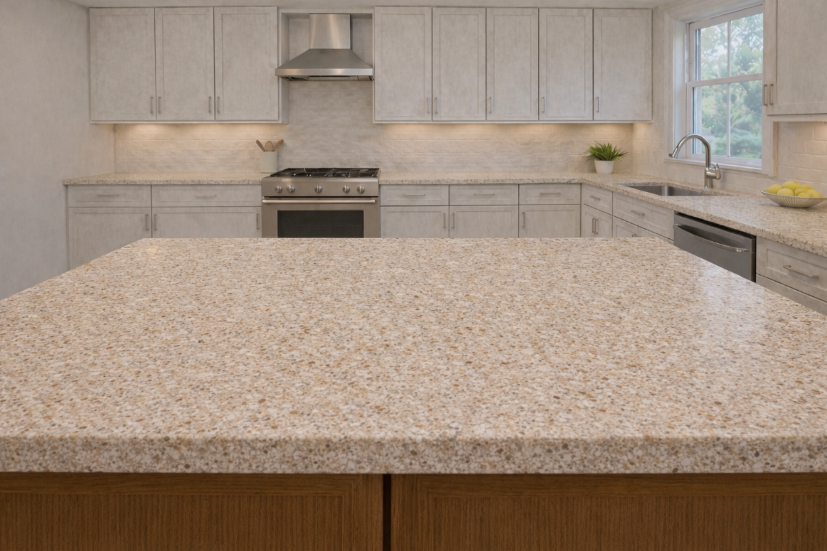 Staron Tempest Rattan (FR-124) — светло‑средний бежево‑песочный оттенок с тёплым соломенно‑золотистым подтоном, цвет натуральный и многослойный, без излишней желтизны и без холодной серости, текстура выполнена в характерной для серии Tempest средне‑ и крупнофракционной стилистике, по поверхности равномерно распределены минеральные включения различных оттенков, что делает Staron Tempest Rattan идеальным для создания расслабляющей атмосферы в любом помещении.
