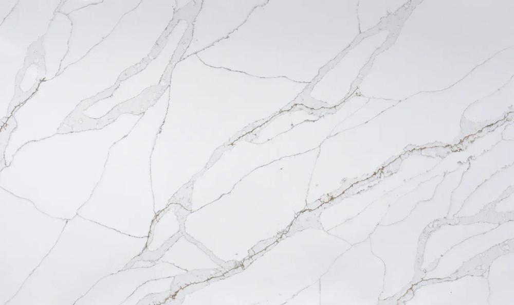 Imperial Quartz Calacatta Lux (5005) - абсолютная белизна с кристаллической прозрачностью, напоминающая ледники и фарфор, широкие, дерзкие прожилки угольного и платинового оттенков создают драматичный контраст, а тонкие золотые акценты, словно блики на позолоченных рамах, добавляют роскоши, что делает Imperial Quartz Calacatta Lux идеальным для создания комфортной атмосферы в любом помещении.