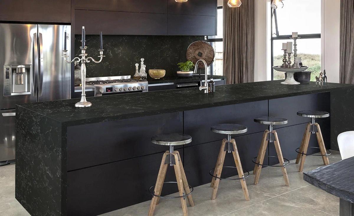 Imperial Quartz Paragona (9000) - глубокий чёрный цвет, напоминающий базальтовые скалы у океана, становится холстом для игры света, белесые прожилки — не грубые и не прямые, а извилистые и динамичные, словно морские волны, оставляющие на песке причудливые узоры, что делает Imperial Quartz Paragona идеальным для создания комфортной атмосферы в любом помещении.