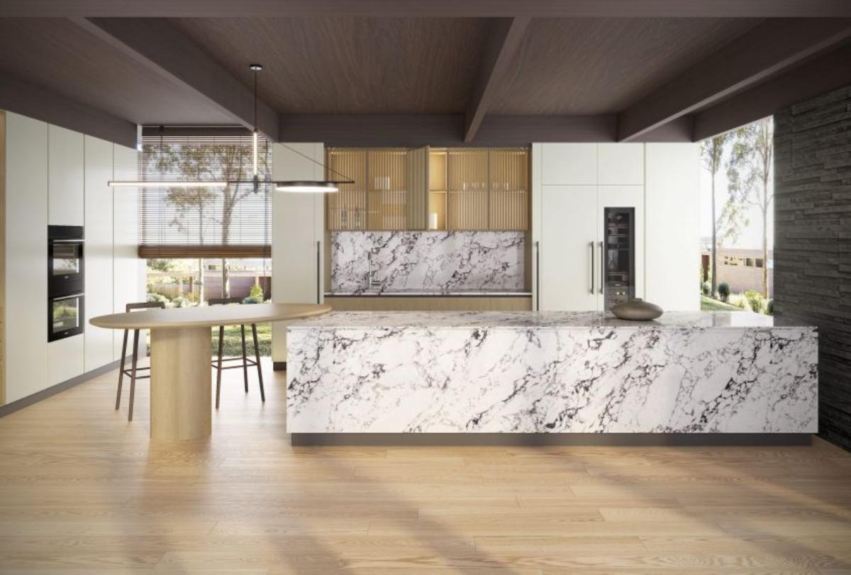 Кварцевый агломерат Symphony Palace содержит 93% натурального кварца, обеспечивая высокую прочностью и устойчивостью к механическим повреждениям, не подвержен сколам и трещинам, что делает идеальным выбором для кухонных столешниц и других высоконагруженных поверхностей.