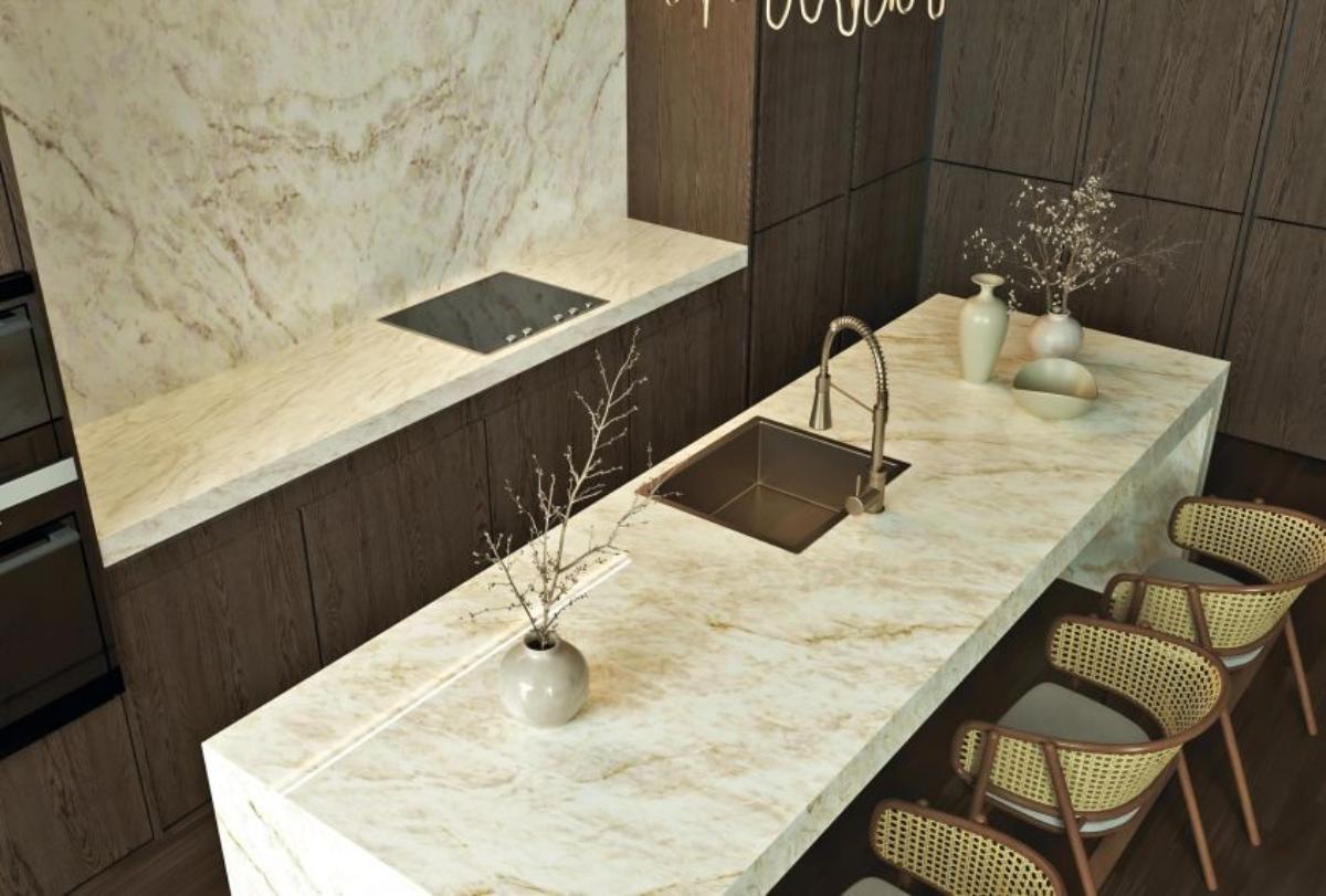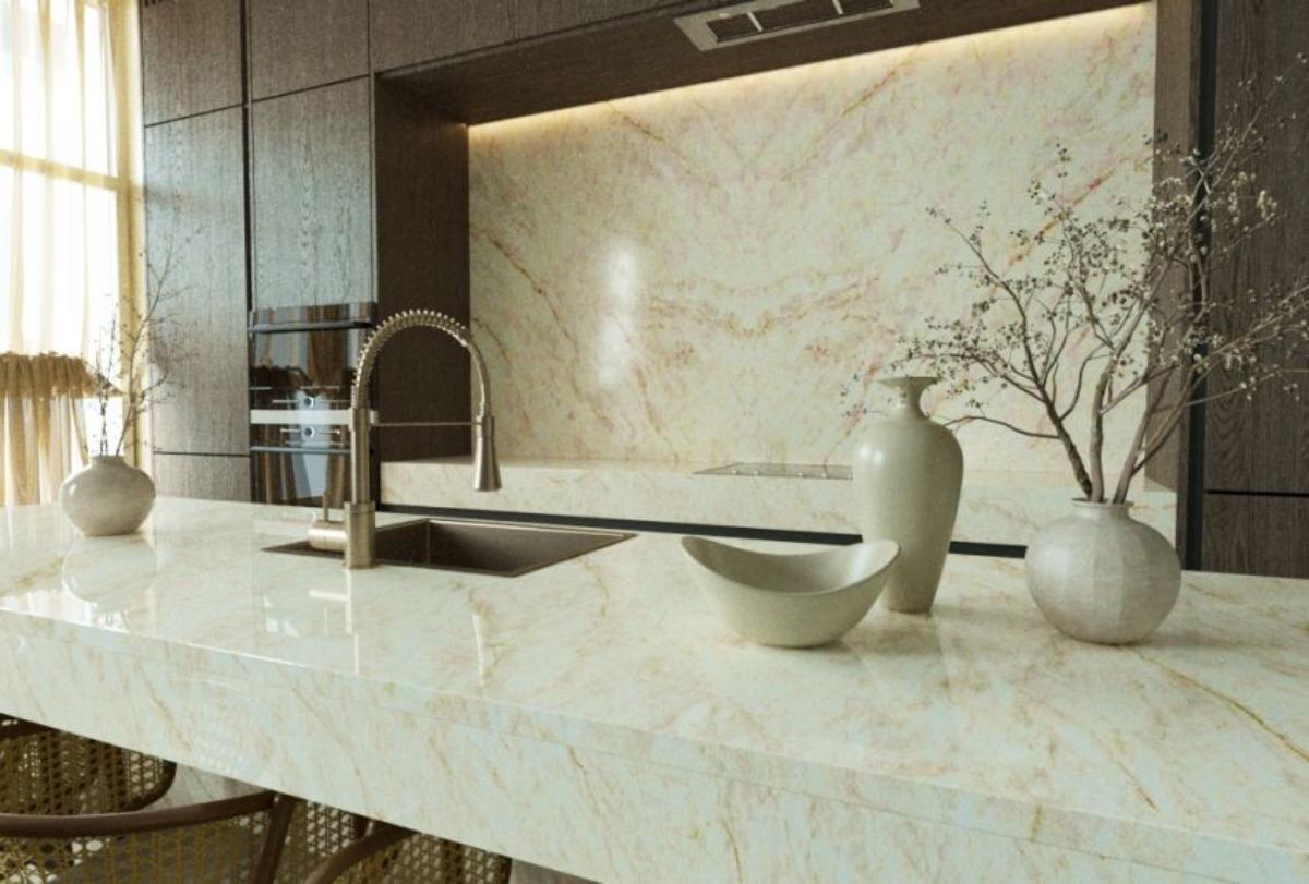 Кварцевый агломерат Symphony Pristine содержит 93% натурального кварца, обеспечивая высокую прочностью и устойчивостью к механическим повреждениям, не подвержен сколам и трещинам, что делает идеальным выбором для кухонных столешниц и других высоконагруженных поверхностей.