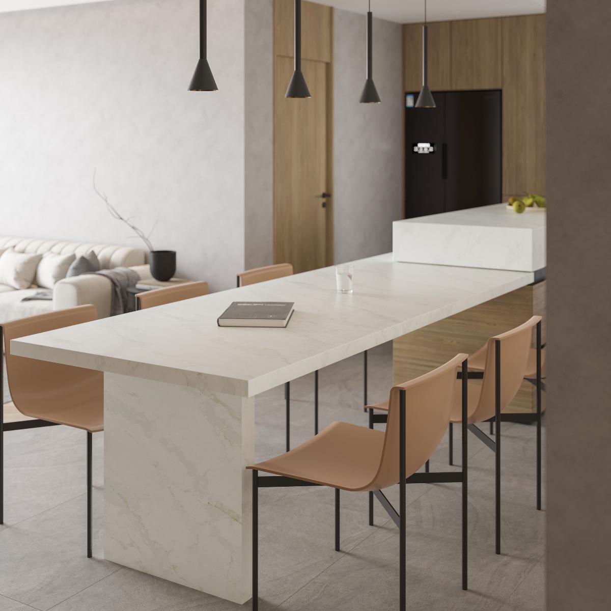 Благодаря своему элегантному дизайну, кварцевый агломерат Alephstone Calacatta Luxe прекрасно вписывается в различные стили интерьеров — от классического до современного, может стать акцентом в интерьере или гармонично дополнить общую концепцию.