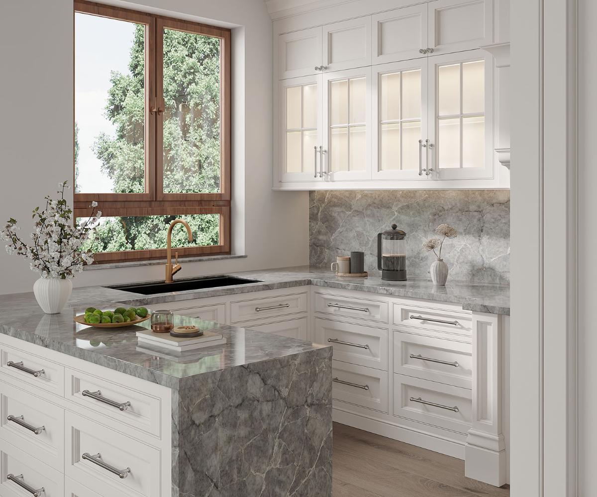 Кварцевый агломерат Alephstone Ocean Grey содержит 93% натурального кварца, обеспечивая высокую прочностью и устойчивостью к механическим повреждениям, не подвержен сколам и трещинам, что делает идеальным выбором для кухонных столешниц и других высоконагруженных поверхностей.