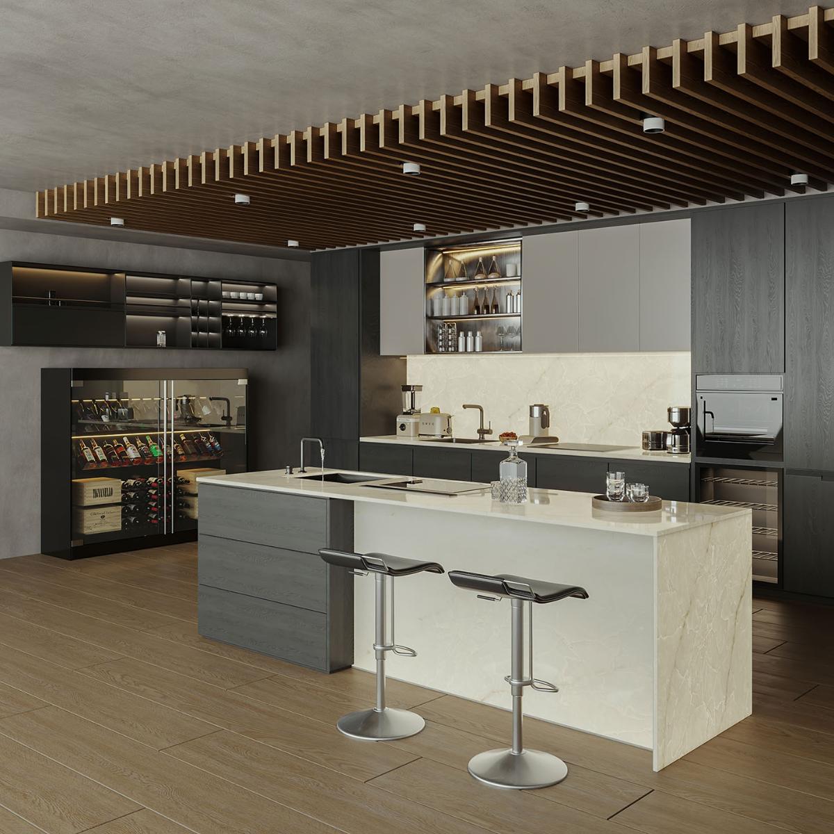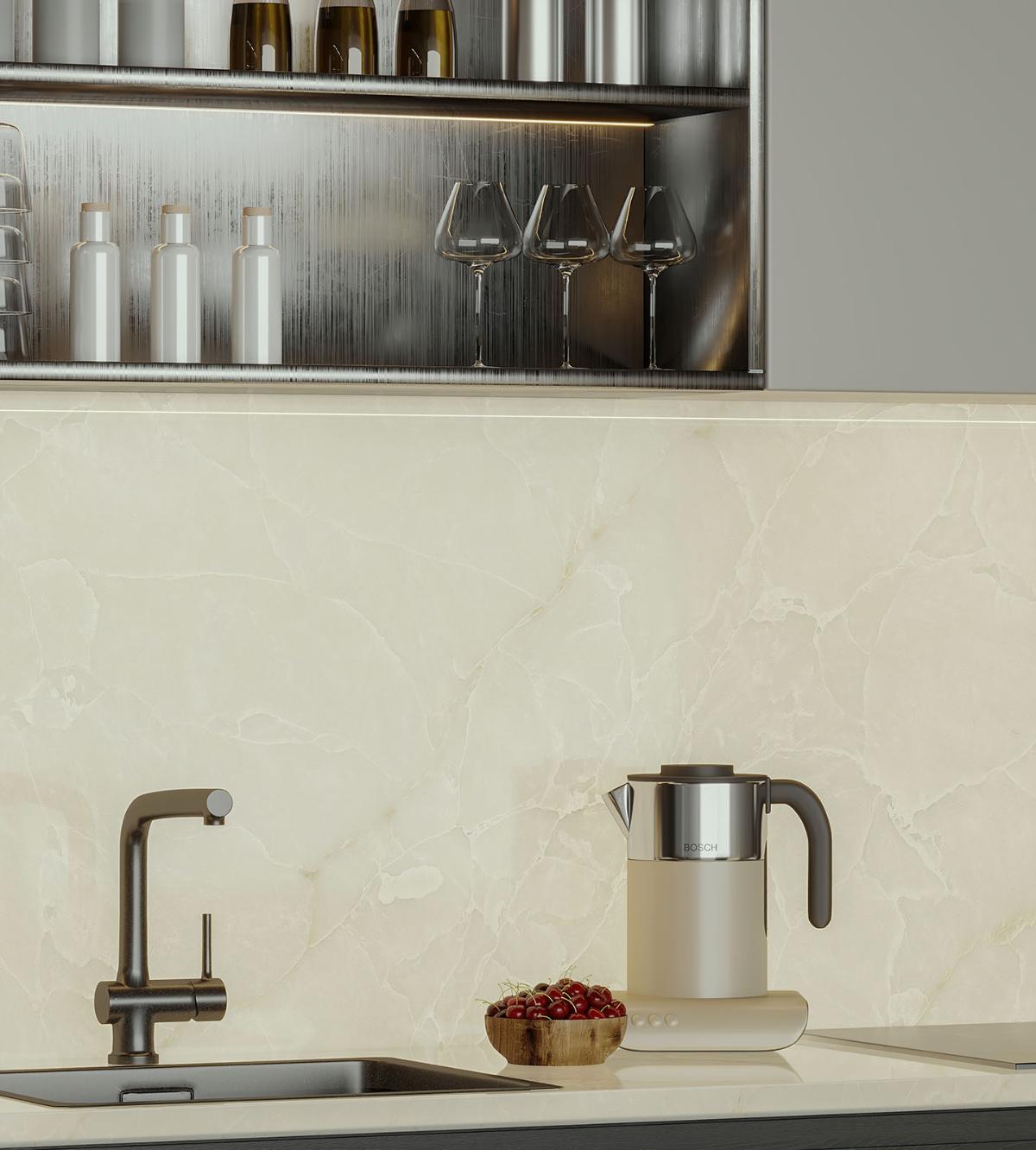 Материал не впитывает жидкости и легко очищается, что делает его гигиеничным и удобным в уходе. Alephstone Onyx Bianco не боится пятен от пищи, напитков и химических веществ, что особенно важно в кухонной среде.