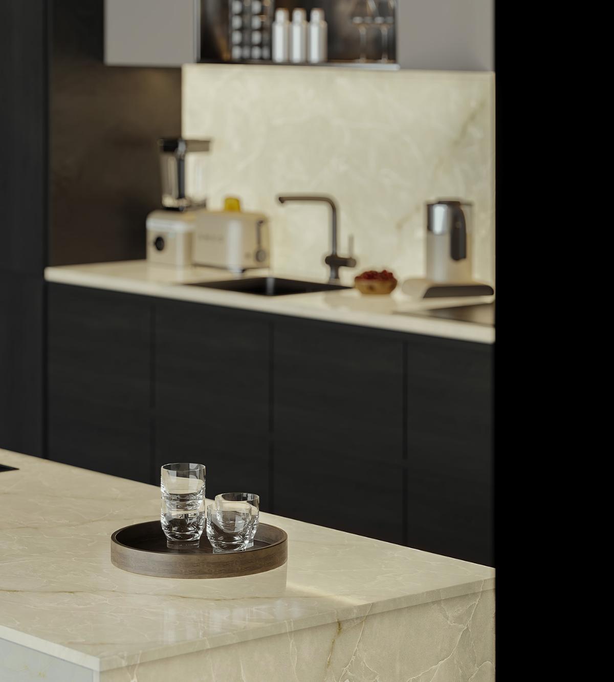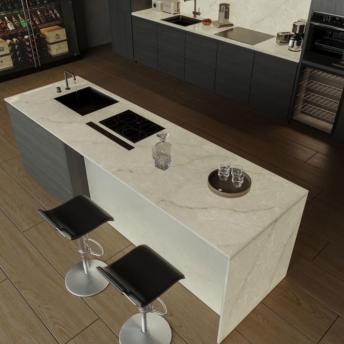 Благодаря своему элегантному дизайну, кварцевый агломерат Alephstone Onyx Bianco прекрасно вписывается в различные стили интерьеров — от классического до современного, может стать акцентом в интерьере или гармонично дополнить общую концепцию.