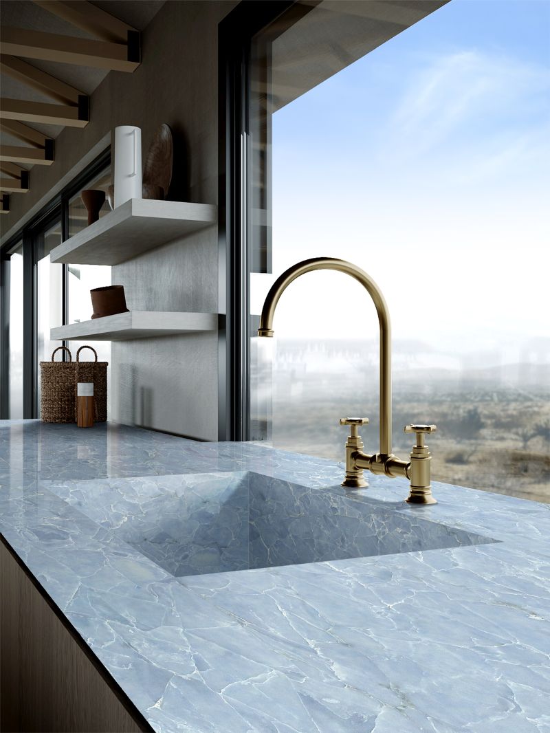 Материал не впитывает жидкости и легко очищается, что делает его гигиеничным и удобным в уходе. Alephstone Onyx Blue не боится пятен от пищи, напитков и химических веществ, что особенно важно в кухонной среде.