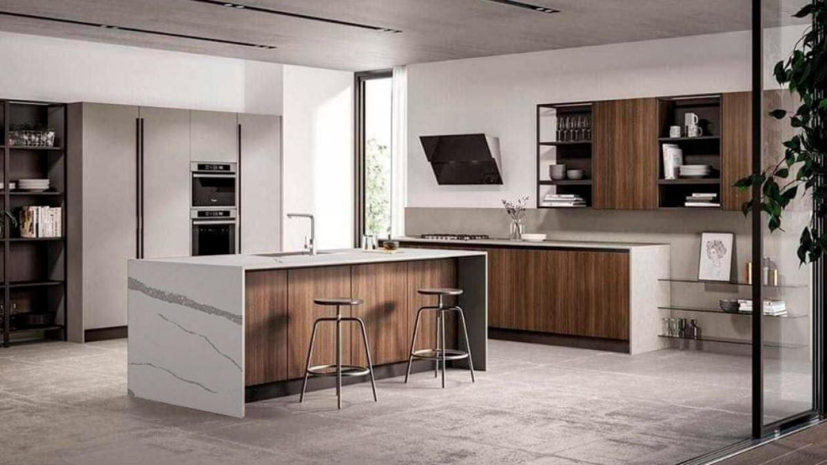 Кварцевый агломерат Asterum Bionica содержит 93% натурального кварца, обеспечивая высокую прочностью и устойчивостью к механическим повреждениям, не подвержен сколам и трещинам, что делает идеальным выбором для кухонных столешниц и других высоконагруженных поверхностей.