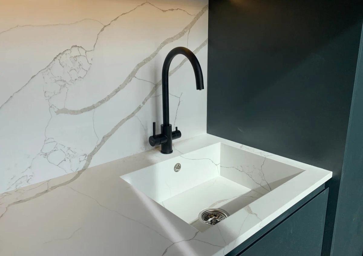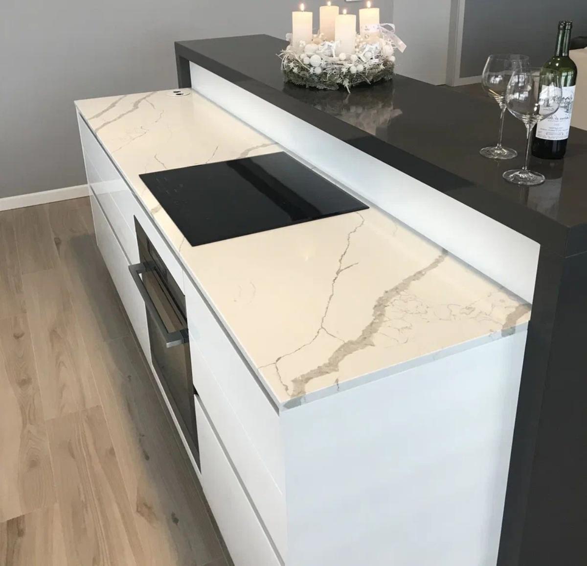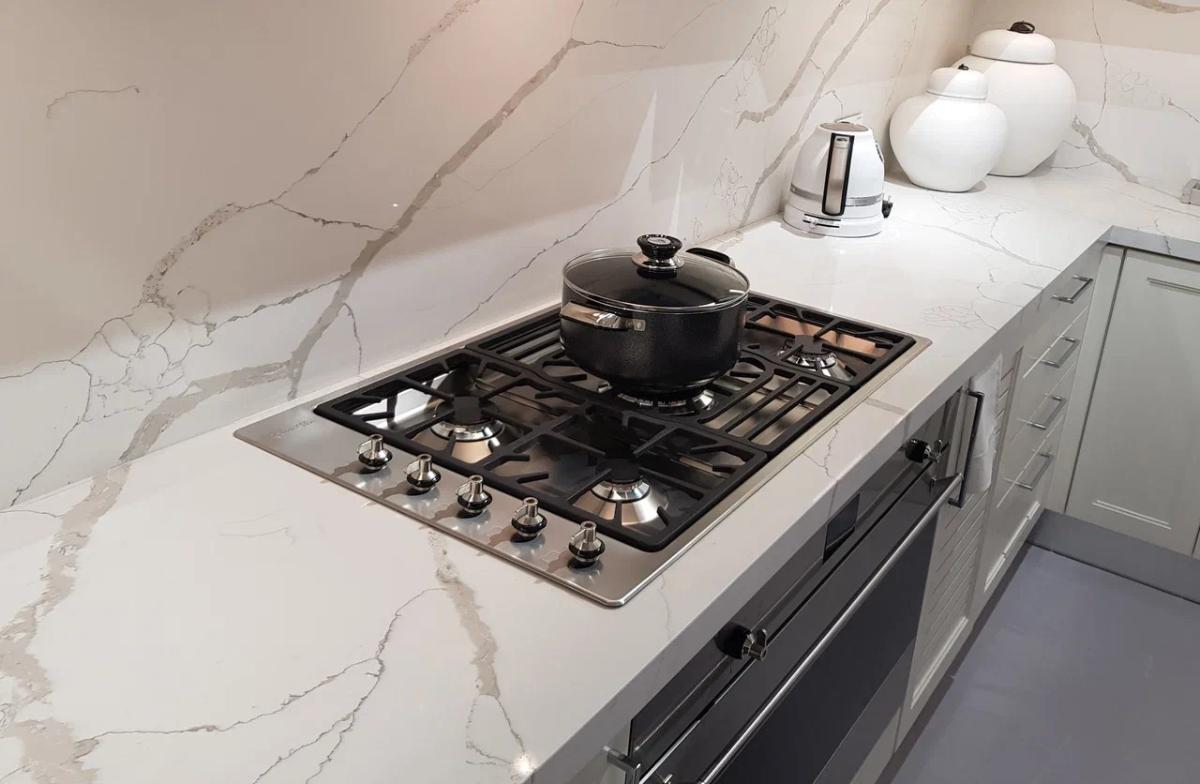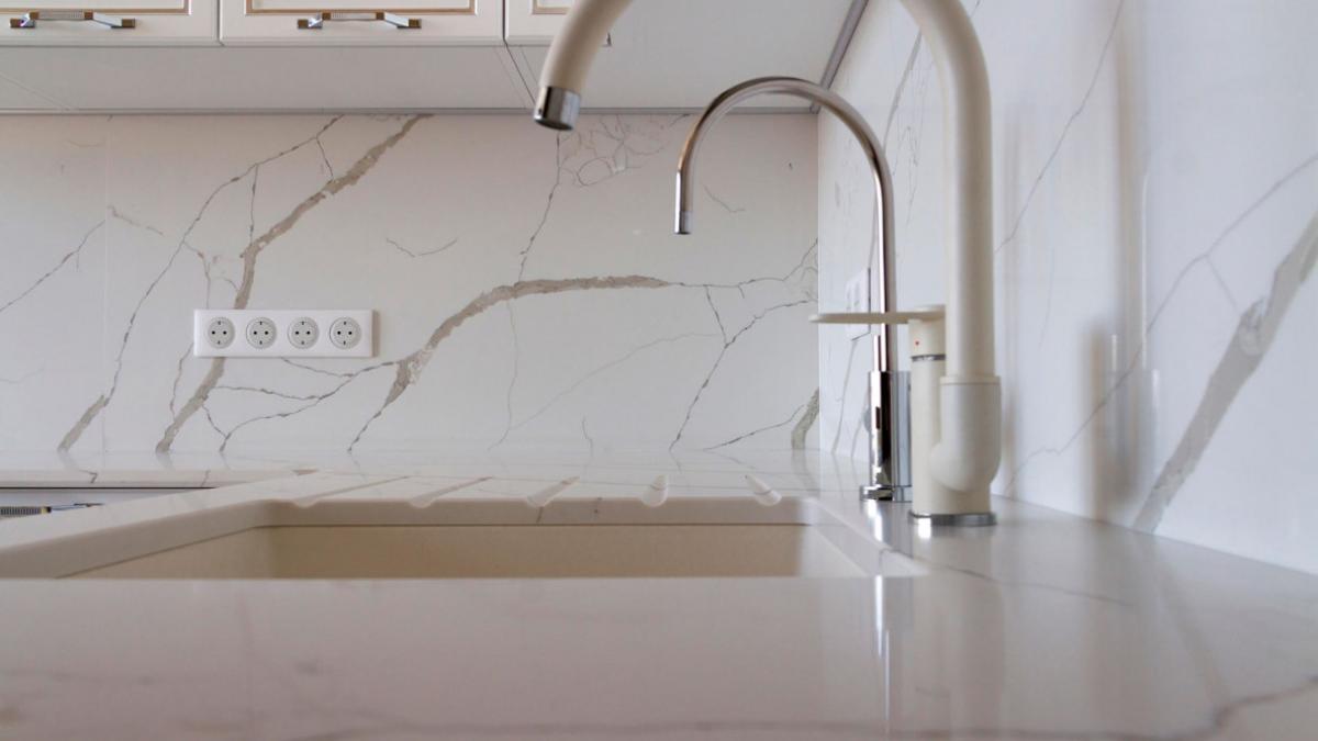 Кварцевый агломерат Asterum Derbent содержит 93% натурального кварца, обеспечивая высокую прочностью и устойчивостью к механическим повреждениям, не подвержен сколам и трещинам, что делает идеальным выбором для кухонных столешниц и других высоконагруженных поверхностей.