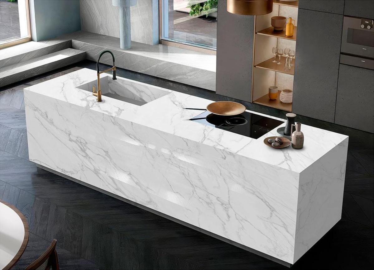 Материал не впитывает жидкости и легко очищается, что делает его гигиеничным и удобным в уходе. Coante Calacatta Fiero не боится пятен от пищи, напитков и химических веществ, что особенно важно в кухонной среде.
