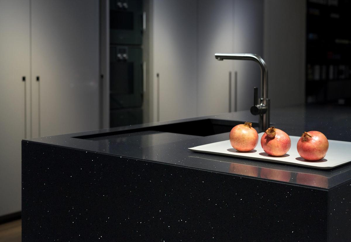 Кварцевый агломерат Coante Cosmic содержит 93% натурального кварца, обеспечивая высокую прочностью и устойчивостью к механическим повреждениям, не подвержен сколам и трещинам, что делает идеальным выбором для кухонных столешниц и других высоконагруженных поверхностей.