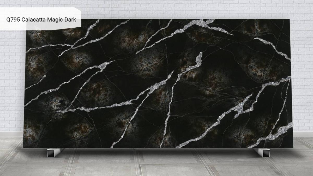 Noblle Calacatta Magic Dark (Q795) глубокий, благородный грифельно-серый, как небо перед грозой, из этого сумрака рождается магия: ослепительно-белые прожилки прорезают его, словно вспышки далёких молний, а лёгкие дымчатые разводы окутывают их, словно туман, рождённый в горном ущелье, что делает Noblle Calacatta Magic Dark идеальным для создания комфортной атмосферы в любом помещении.