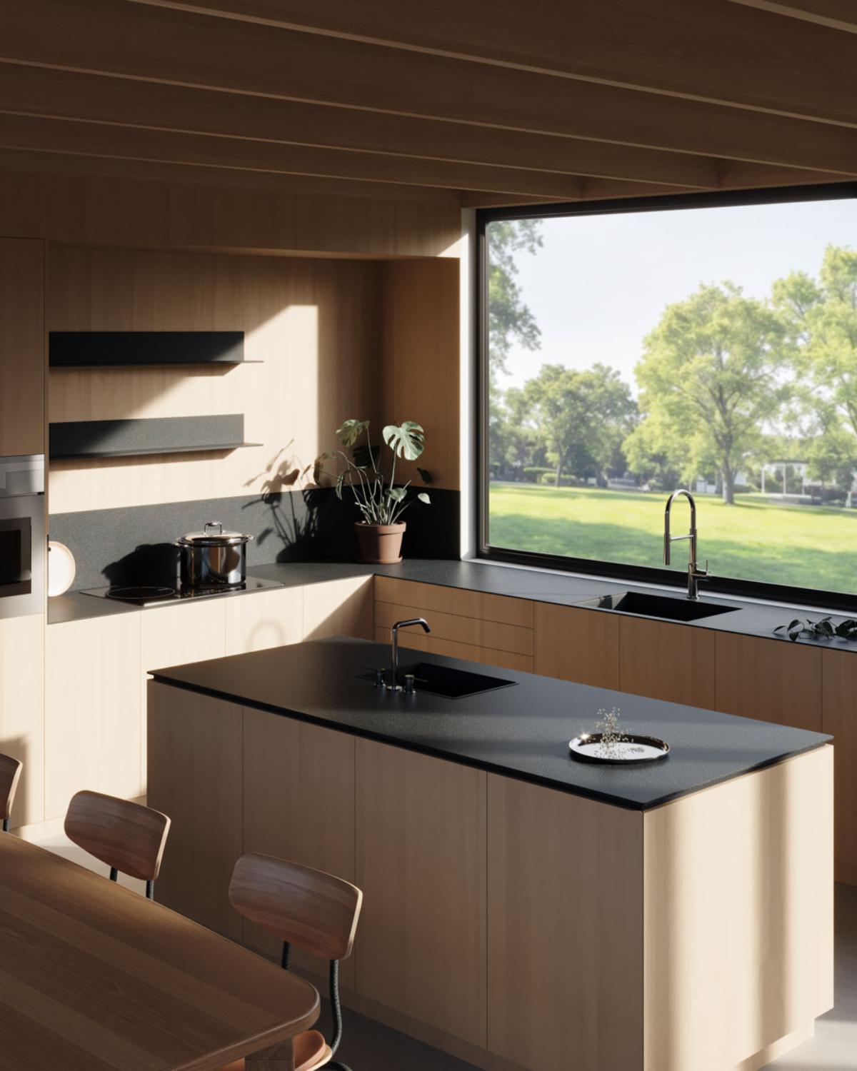 Материал не впитывает жидкости и легко очищается, что делает его гигиеничным и удобным в уходе. Primax Black Satin не боится пятен от пищи, напитков и химических веществ, что особенно важно в кухонной среде.