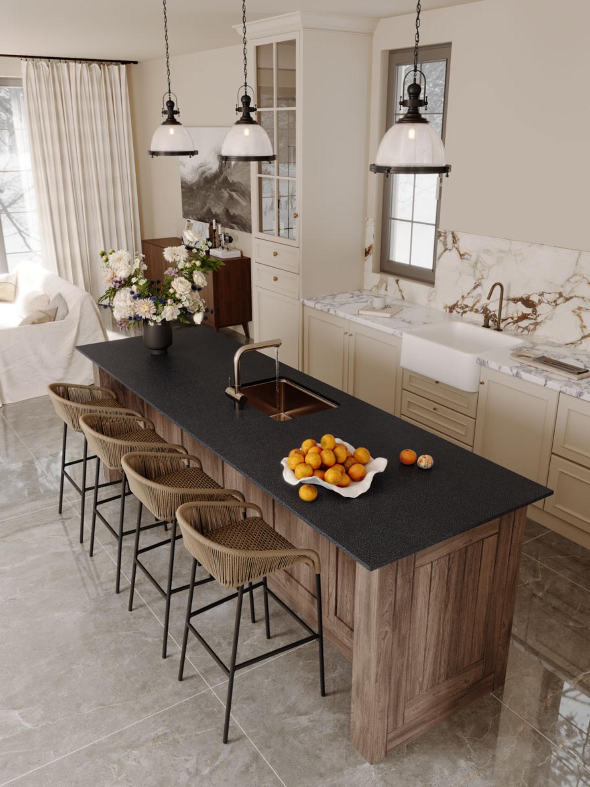 Благодаря своему элегантному дизайну, кварцевый агломерат Primax Black Satin прекрасно вписывается в различные стили интерьеров — от классического до современного, может стать акцентом в интерьере или гармонично дополнить общую концепцию.