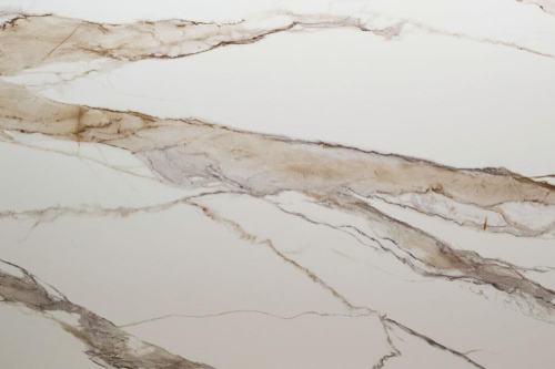 Primax Calacatta Creme (709) поверхность, словно кремовая гладь, отражает свет, создавая игру теней и бликов, нежные оттенки белого и кремового, плавно переходящие друг в друга, создают ощущение мягкости и уюта, что делает Primax Calacatta Creme идеальным для создания комфортной атмосферы в любом помещении.