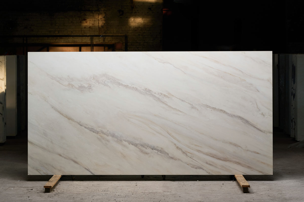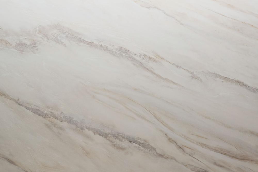 Кварцевый агломерат Primax Calacatta Infinite Dunes содержит 93% натурального кварца, обеспечивая высокую прочностью и устойчивостью к механическим повреждениям, не подвержен сколам и трещинам, что делает идеальным выбором для кухонных столешниц и других высоконагруженных поверхностей.