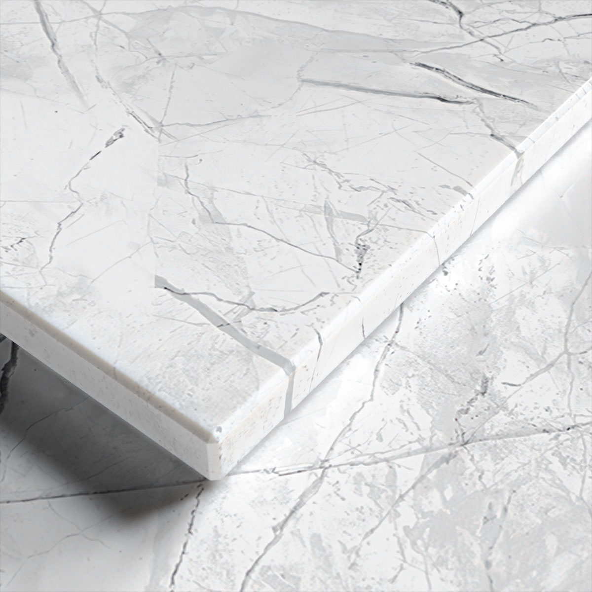 Primax Calacatta La Carta (724) поверхность, словно старинная карта, покрыта нежными оттенками белого и серого, которые плавно переходят друг в друга, создавая ощущение глубины и тайны, тонкие золотистые прожилки, словно линии на карте, пронизывают камень, добавляя ему жизни и энергии, что делает Primax Calacatta La Carta идеальным для создания комфортной атмосферы в любом помещении.