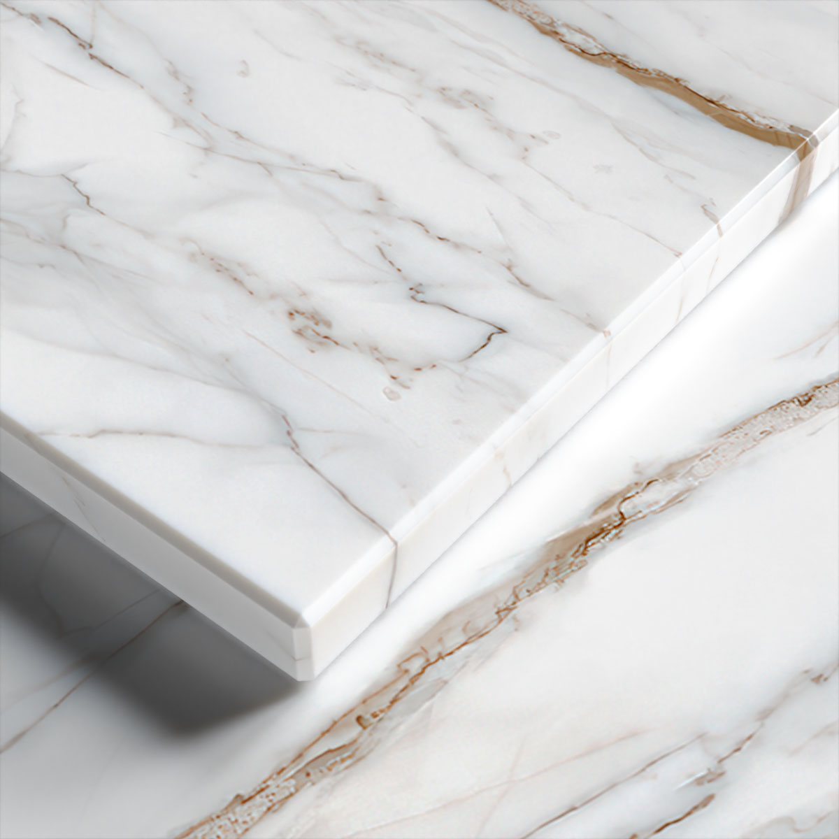 Кварцевый агломерат Primax Calacatta Platino Bianco содержит 93% натурального кварца, обеспечивая высокую прочностью и устойчивостью к механическим повреждениям, не подвержен сколам и трещинам, что делает идеальным выбором для кухонных столешниц и других высоконагруженных поверхностей.