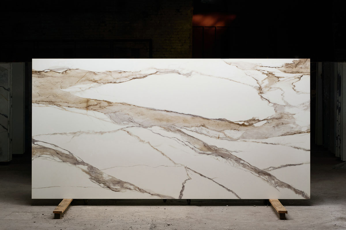 Кварцевый агломерат Primax Calacatta Sienna содержит 93% натурального кварца, обеспечивая высокую прочностью и устойчивостью к механическим повреждениям, не подвержен сколам и трещинам, что делает идеальным выбором для кухонных столешниц и других высоконагруженных поверхностей.