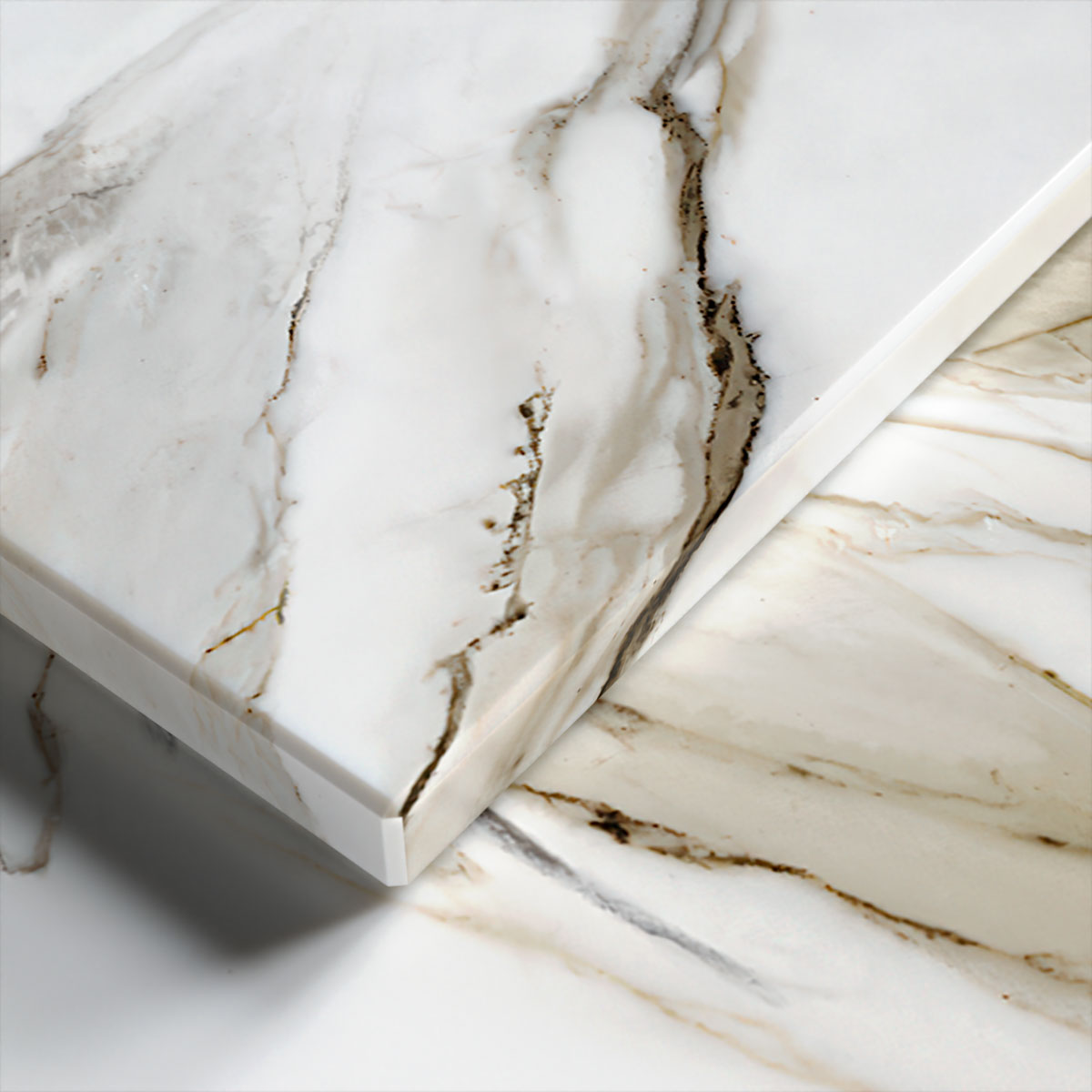 Primax Calacatta Sienna (707) поверхность, словно золотистые листья, отражает свет, создавая игру теней и бликов, нежные оттенки белого и золотого, плавно переходящие друг в друга, создают ощущение легкости и воздушности, что делает Primax Calacatta Sienna идеальным для создания комфортной атмосферы в любом помещении.