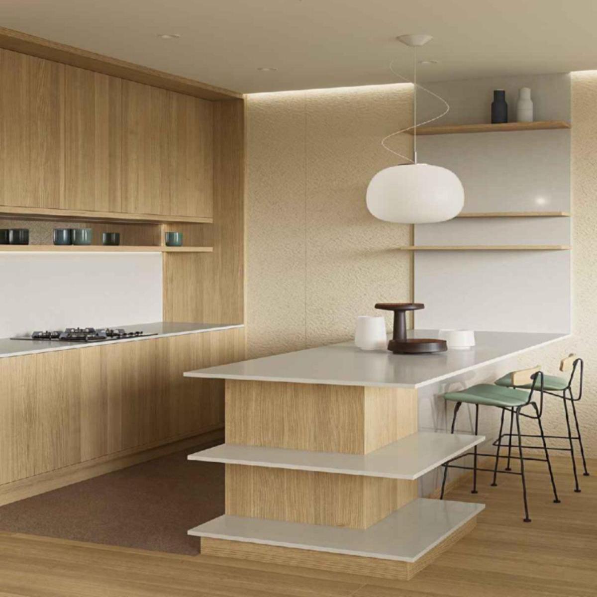 Кварцевый агломерат Primax Crystal White содержит 93% натурального кварца, обеспечивая высокую прочностью и устойчивостью к механическим повреждениям, не подвержен сколам и трещинам, что делает идеальным выбором для кухонных столешниц и других высоконагруженных поверхностей.
