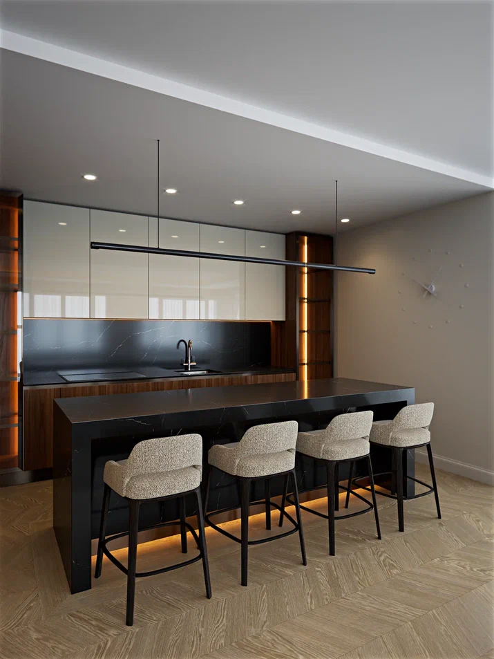 Благодаря своему элегантному дизайну, кварцевый агломерат Primax Noir Satin прекрасно вписывается в различные стили интерьеров — от классического до современного, может стать акцентом в интерьере или гармонично дополнить общую концепцию.