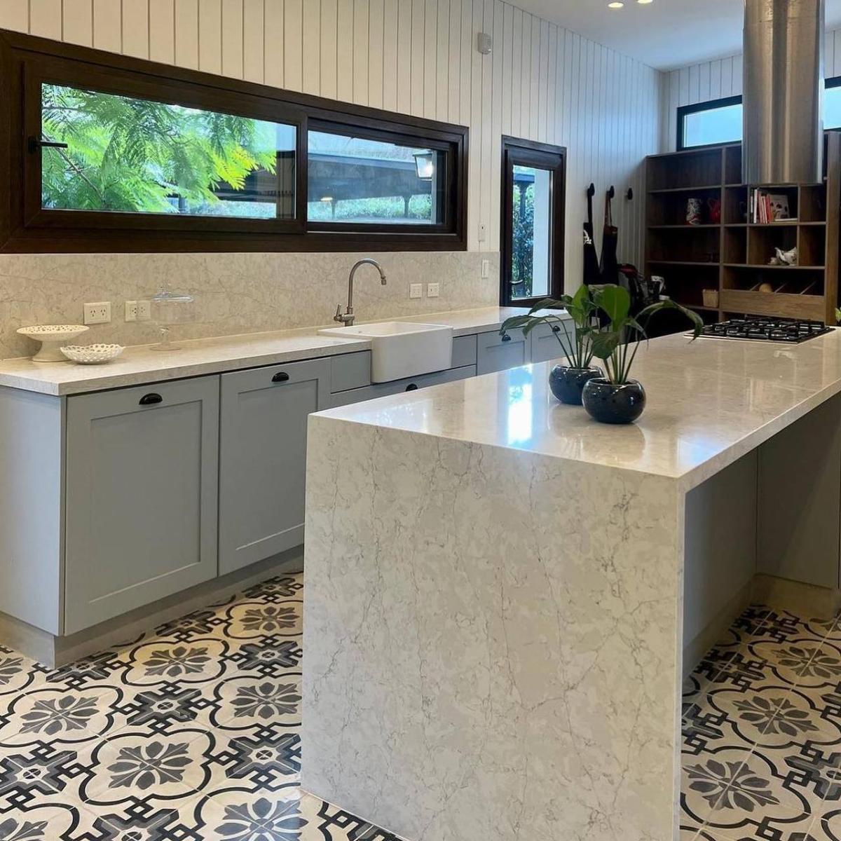 Кварцевый агломерат Silestone Pearl Jasmine содержит 93% натурального кварца, обеспечивая высокую прочностью и устойчивостью к механическим повреждениям, не подвержен сколам и трещинам, что делает идеальным выбором для кухонных столешниц и других высоконагруженных поверхностей.