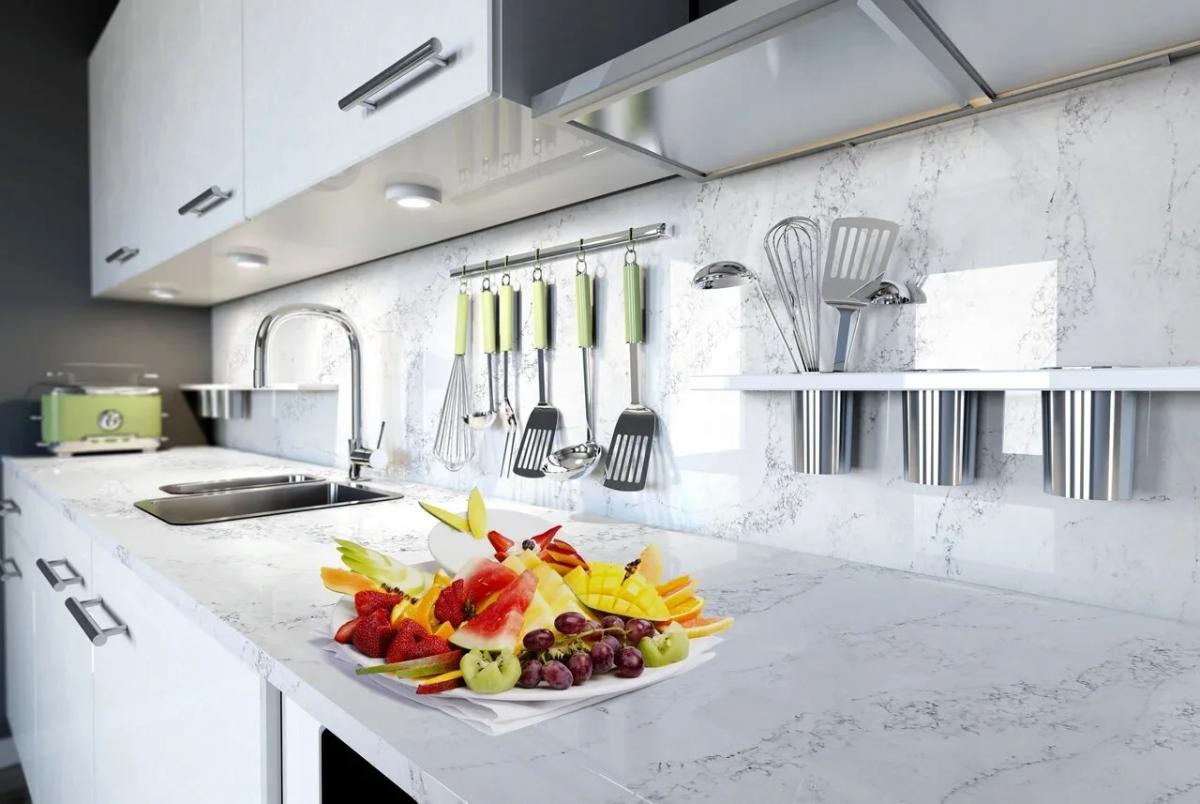 Кварцевый агломерат Stratos Marina содержит 93% натурального кварца, обеспечивая высокую прочностью и устойчивостью к механическим повреждениям, не подвержен сколам и трещинам, что делает идеальным выбором для кухонных столешниц и других высоконагруженных поверхностей.