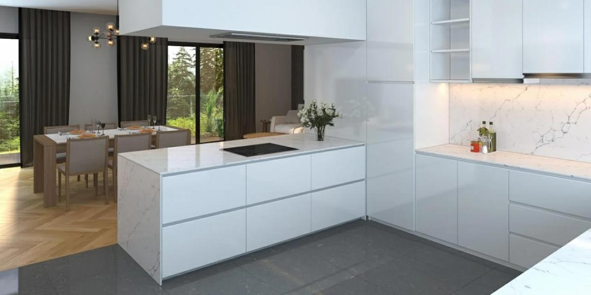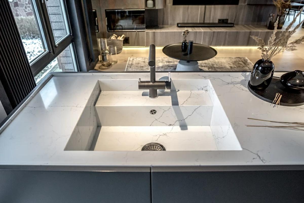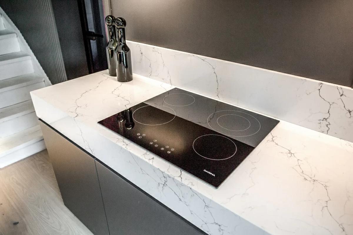 Кварцевый агломерат Vicostone Venatino содержит 93% натурального кварца, обеспечивая высокую прочностью и устойчивостью к механическим повреждениям, не подвержен сколам и трещинам, что делает идеальным выбором для кухонных столешниц и других высоконагруженных поверхностей.