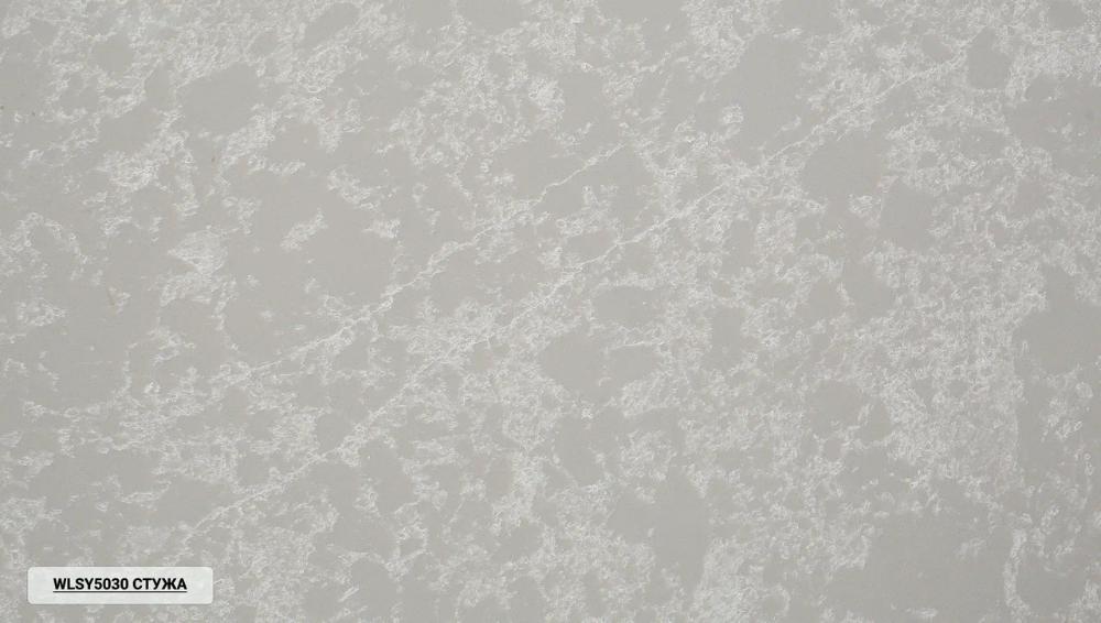 Кварцевый агломерат WSP Stone Стужа содержит 93% натурального кварца, обеспечивая высокую прочностью и устойчивостью к механическим повреждениям, не подвержен сколам и трещинам, что делает идеальным выбором для кухонных столешниц и других высоконагруженных поверхностей.